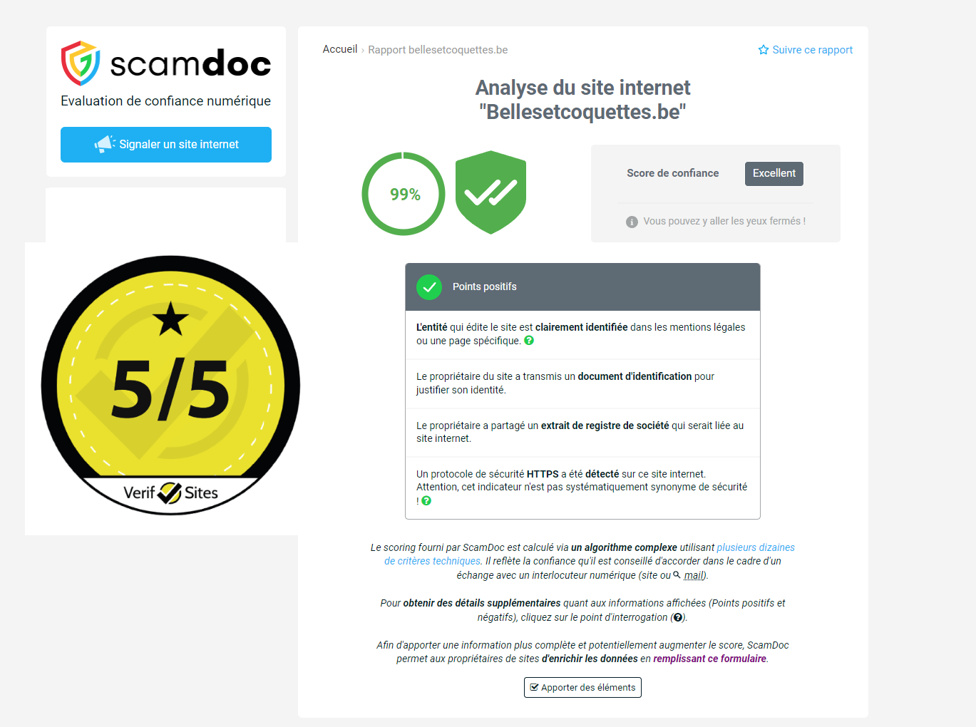Nous sommes fiers de vous offrir une expérience en ligne fiable et sécurisée. Notre site est évalué 5/5 sur VerifSites et 99% sur ScamDoc, des plateformes indépendantes reconnues pour leur expertise en vérification de sites web. Vos transactions et données personnelles sont protégées par des technologies de pointe, vous garantissant ainsi une navigation en toute sérénité. Faites-nous confiance pour vos achats en ligne en toute sécurité !