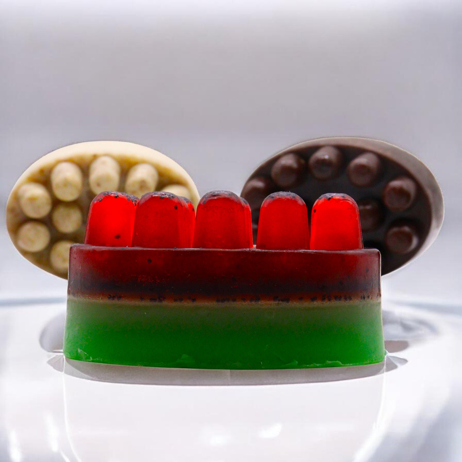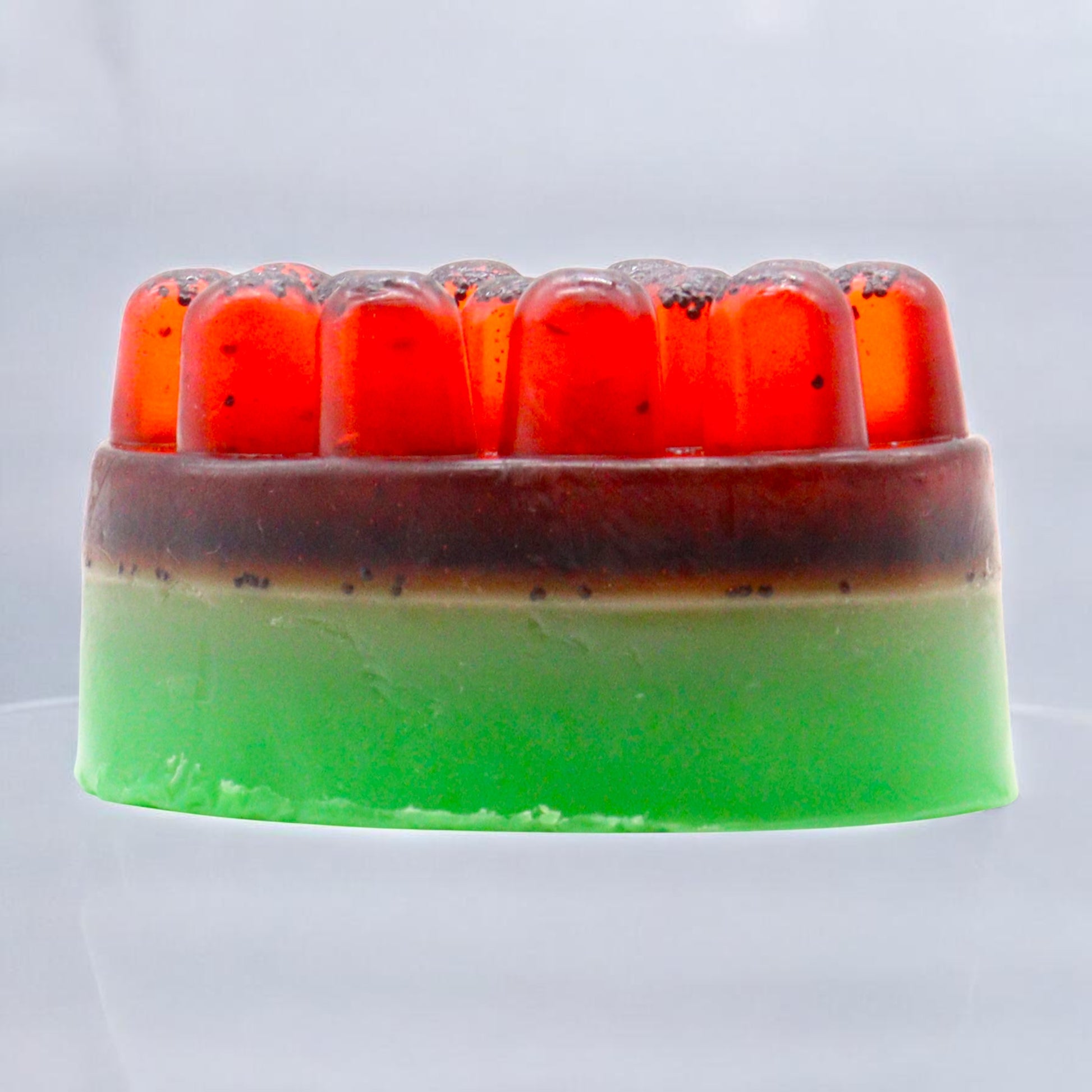 Chaque pain de savon de 130 g (8,3 × 5,8 × 4 cm) présente une surface nodulée conçue pour stimuler la circulation pendant le lavage.